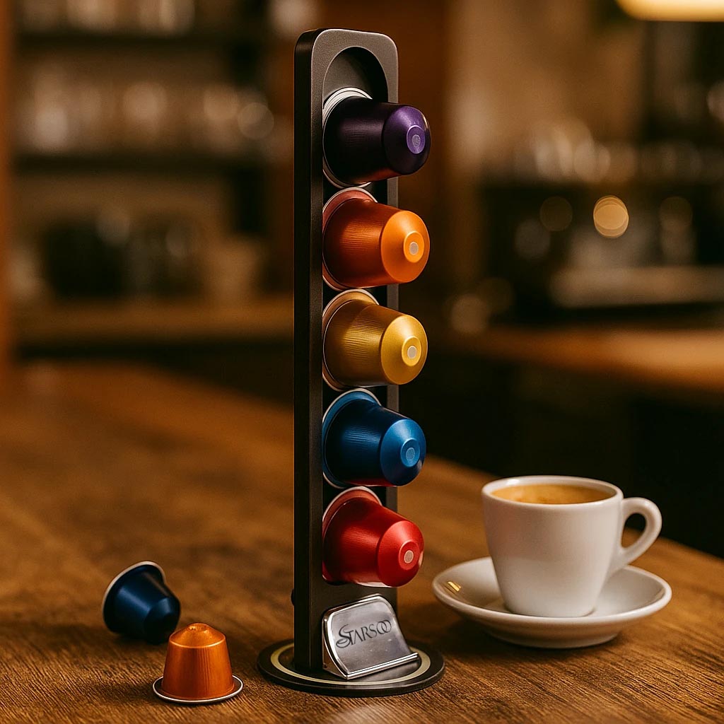 - این استند با طراحی جمعوجور و زیبا، پنج کپسول قهوه را در خود جای میدهد.