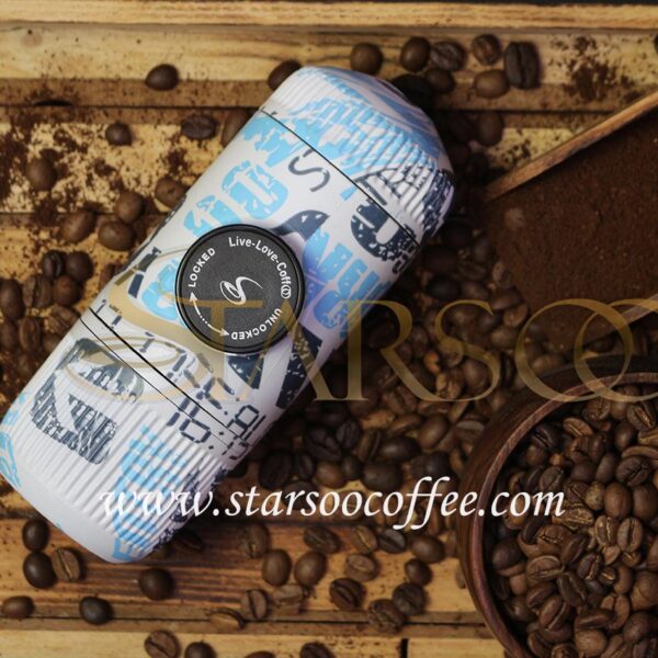 یکی از نقاط قوت اصلی قهوه ساز همراه استارسو، طراحی منحصر به فرد آن‌ها است. این دستگاه با طراحی گرافیتی شهری و رنگ‌های آبی و مشکی روی زمینه سفید، جلوه‌ای مدرن و پویا دارد که حس و حال زندگی شهری را به خوبی منتقل می‌کند.