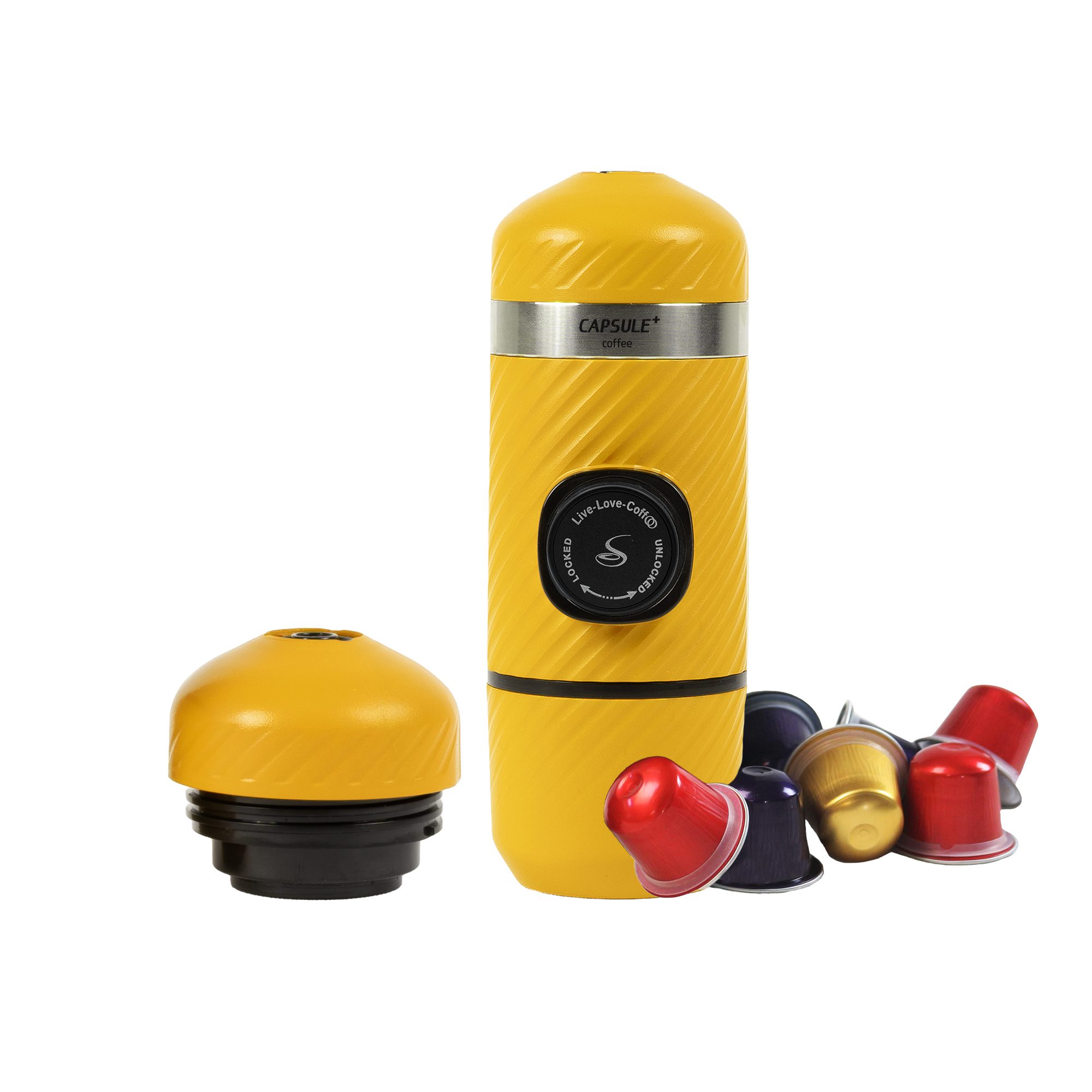 قهوه ساز کپسولی زرد همراه با کیف ضد آب و مبدل