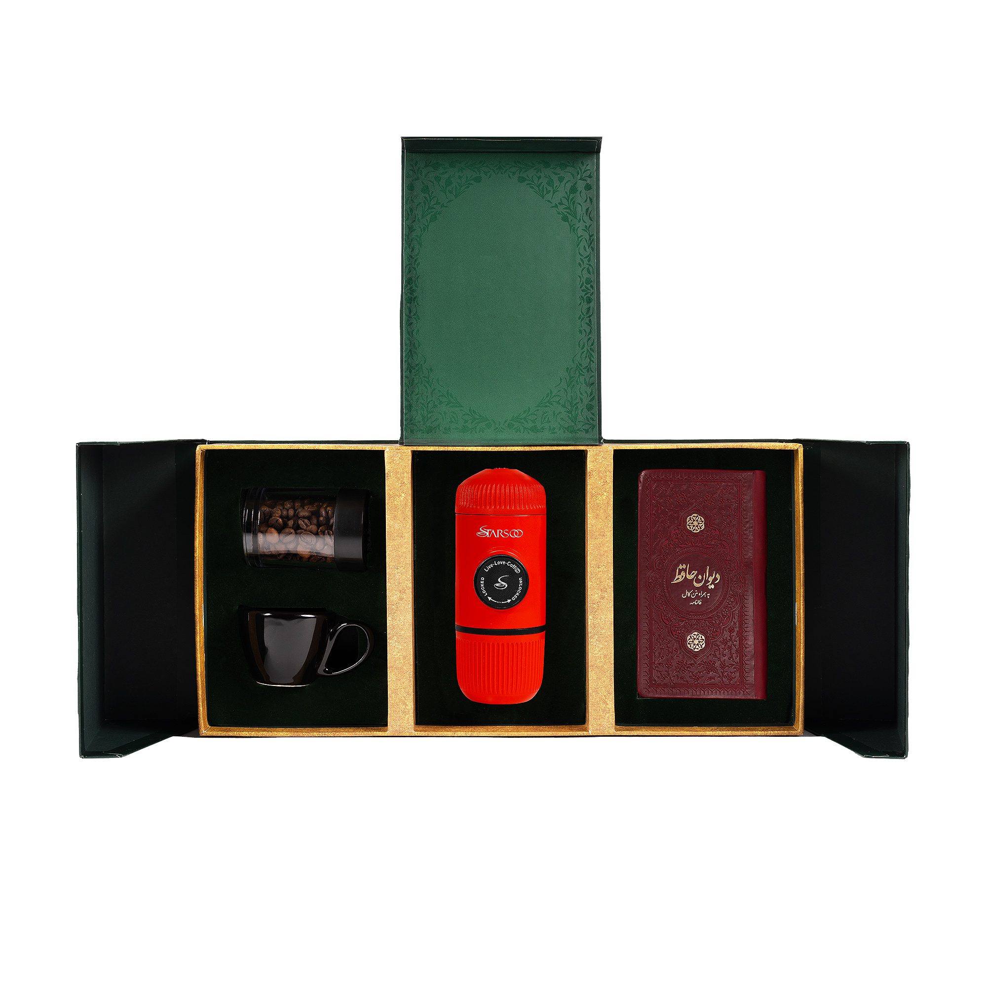 این باکس با طراحی لوکس و محتوای منحصربهفردش، بهعنوان یک هدیه خاص و متفاوت برجسته میشود. ترکیب عناصر مدرن مانند قهوهساز همراه با اقلامی سنتی همچون دیوان حافظ، این هدیه را برای هر سلیقه و هر نسل جذاب میکند.
